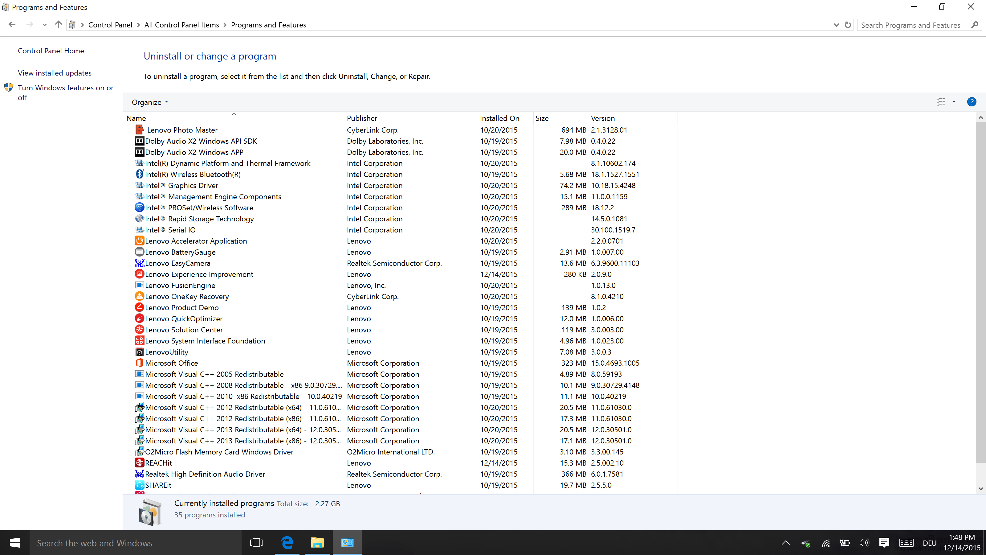 After the Superfish fiasco, amongst some others, Lenovo promised us cleaner Windows installs. Indeed, the only piece of software that annoyed me was McAfee. After uninstalling it, I was left with the following software and drivers: